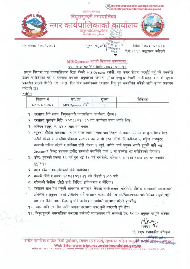 MIS Operator पदको विज्ञापन सम्बन्धमा ।