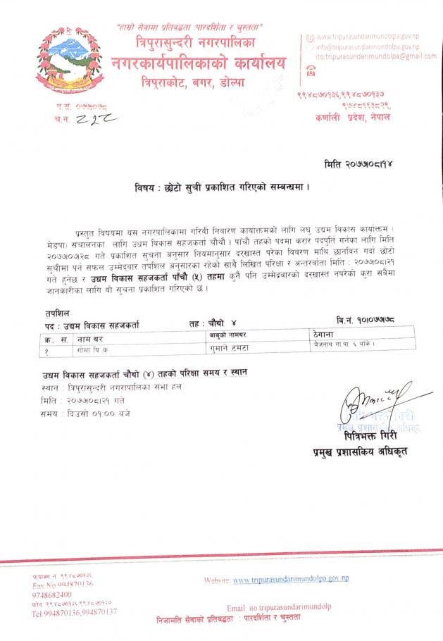 उद्यम बिकास सहजकर्ता short list सूचना प्रकाशित गरिएको बारे