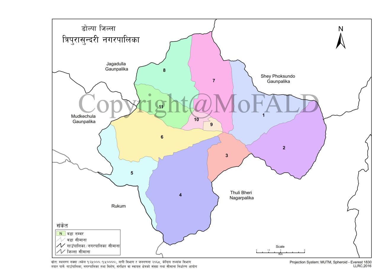 नेपाल अधिराज्यको सविधान २०७२ अनुसार राज्य पुनर्सरचना अन्तर्गत कर्णली प्रदेशमा पर्ने डोल्पा जिल्ला सबै भन्दा ठूलो जिल्ला हो।नेपालको हिमाली क्षेत्रमा अवस्थित डोल्पा जिल्लाको कुल क्षेत्रफल ७८५९ वर्ग कि.मि. रहेको छ जुन नेपाल अधराज्यको कुल क्षेत्रफलको ५.३८ प्रतिशात हुन आउछ।साविकका त्रिपुराकोट, पाहाडा, लिकु, ल्हाँ र सुँ गा.बि.स. हरुको संयोजनमा हाल त्रिपुरासुन्दरी नगरपालीकाको निर्माण भएको छ।समुद्र सतह देखि २००० मिटरदेखि ५००० मिटर सम्मको उचाइमा रहेको यस त्रपुरास्न्दरी नगरपालीका ३९३.४५ बर्ग कि.मी क्षेत्रफलमा फैलिएको छ । यस नगरपालिकाको कुल जनसंख्या १२,७४५ मध्ये ६,०८६ पुरुष र ६,६९५ महिला रहेको छ। यस नगरपालीकाको उत्तरमा शे-फोक्सुण्डो गाउँपालिका, दक्षिणमा रुकम जिल्लाको सिमाना, पश्चिममा मुड्केचुला र जगदुल्ला गाउँपालिकाको सिमाना पर्दछ भने पूर्वमा डोल्पाको अर्को ठलीभेरी नगरपालिकाको सिमानासँग जोडएको छ।यस नगरपालीकामा जम्मा ११ बटा बडाहरु रहेका छन्।